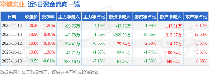 证券之星消息,截至2025年11月14日收盘,彩蝶实业(603073)报收于20.2元,上涨1.2%,换手率2.35%,成交量1.2万手,成交额2409.82万元。