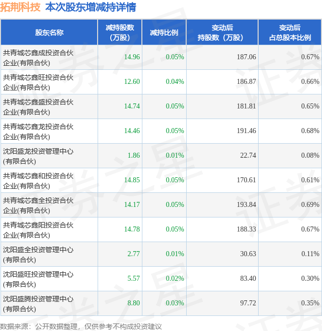 证券之星消息,11月14日拓荆科技发布公告《拓荆科技:股东集中竞价减持股份结果公告》,其股东共青城芯鑫成投资合伙企业(有限合伙)、共青城芯鑫旺投资合伙企业(有限合伙)、共青城芯鑫盛投资合伙企业(有限合伙)、共青城芯鑫龙投资合伙企业(有限合伙)、沈阳盛龙投资管理中心(有限合伙)、共青城芯鑫和投资合伙企业(有限合伙)、共青城芯鑫全投资合伙企业(有限合伙)、共青城芯鑫阳投资合伙企业(有限合伙)、沈阳盛全投资管理中心(有限合伙)、沈阳盛旺投资管理中心(有限合伙)、沈阳盛腾投资管理中心(有限合伙)于2025年11月8日至2025年11月14日间合计减持119.57万股,占公司目前总股本的0.4252%,变动期间该股股价下跌0.99%,截止11月14日收盘报330.0元。