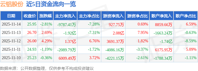 证券之星消息,截至2025年11月14日收盘,云铝股份(000807)报收于25.95元,下跌2.81%,换手率1.48%,成交量51.44万手,成交额13.44亿元。
