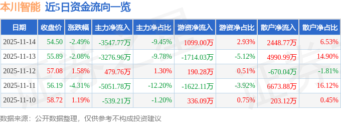 证券之星消息,截至2025年11月14日收盘,本川智能(300964)报收于54.5元,下跌2.49%,换手率12.15%,成交量6.69万手,成交额3.75亿元。