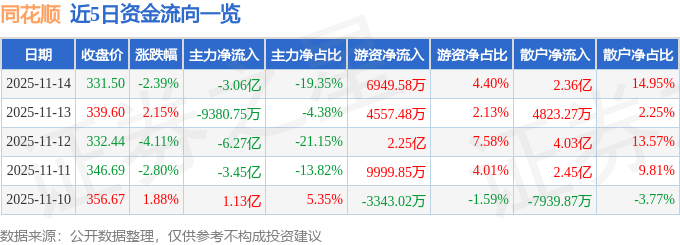 证券之星消息,截至2025年11月14日收盘,同花顺(300033)报收于331.5元,下跌2.39%,换手率1.71%,成交量4.72万手,成交额15.79亿元。