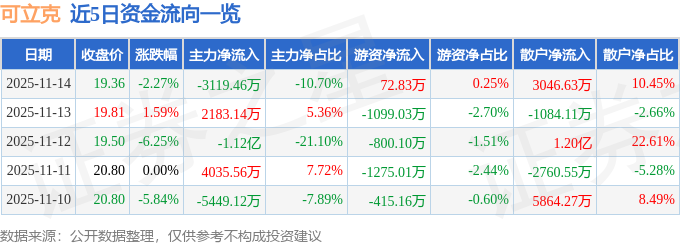 11月14日的资金流向数据方面,主力资金净流出3119.46万元,占总成交额10.7%,游资资金净流入72.83万元,占总成交额0.25%,散户资金净流入3046.63万元,占总成交额10.45%。