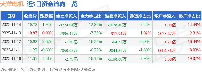 证券之星消息,截至2025年11月14日收盘,大洋电机(002249)报收于10.72元,下跌1.92%,换手率3.8%,成交量69.58万手,成交额7.52亿元。