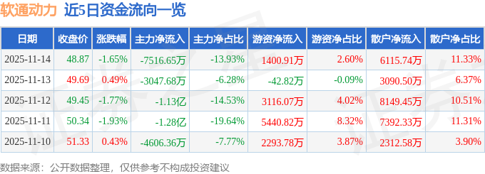 证券之星消息,截至2025年11月14日收盘,软通动力(301236)报收于48.87元,下跌1.65%,换手率1.39%,成交量10.9万手,成交额5.4亿元。