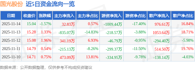 证券之星消息,截至2025年11月14日收盘,国光股份(002749)报收于15.04元,下跌1.57%,换手率0.84%,成交量3.83万手,成交额5800.05万元。