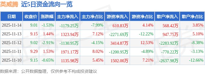 11月14日的资金流向数据方面,主力资金净流出1179.25万元,占总成交额7.99%,游资资金净流入610.83万元,占总成交额4.14%,散户资金净流入568.42万元,占总成交额3.85%。