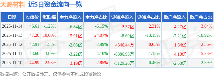 证券之星消息,截至2025年11月14日收盘,天赐材料(002709)报收于46.61元,下跌1.25%,换手率16.18%,成交量231.48万手,成交额111.21亿元。