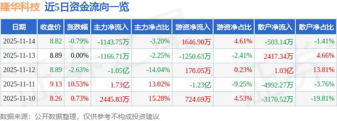 证券之星消息,截至2025年11月14日收盘,隆华科技(300263)报收于8.82元,下跌0.79%,换手率4.14%,成交量40.36万手,成交额3.57亿元。