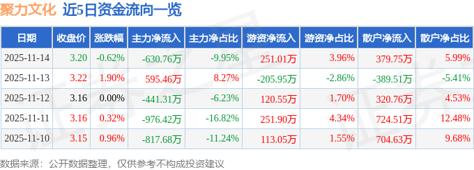 证券之星消息,截至2025年11月14日收盘,聚力文化(002247)报收于3.2元,下跌0.62%,换手率3.07%,成交量19.74万手,成交额6341.81万元。