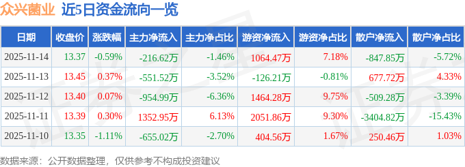 证券之星消息,截至2025年11月14日收盘,众兴菌业(002772)报收于13.37元,下跌0.59%,换手率2.82%,成交量10.99万手,成交额1.48亿元。