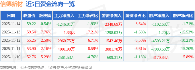 证券之星消息,截至2025年11月14日收盘,信德新材(301349)报收于59.22元,下跌0.54%,换手率21.78%,成交量10.65万手,成交额6.45亿元。