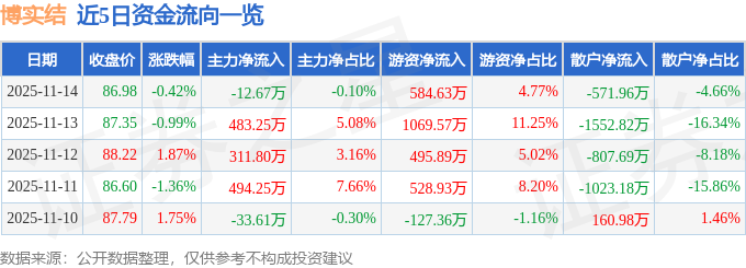 证券之星消息,截至2025年11月14日收盘,博实结(301608)报收于86.98元,下跌0.42%,换手率3.47%,成交量1.39万手,成交额1.23亿元。
