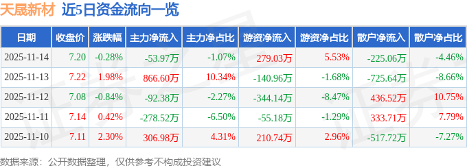 证券之星消息,截至2025年11月14日收盘,天晟新材(300169)报收于7.2元,下跌0.28%,换手率2.32%,成交量7.0万手,成交额5047.46万元。