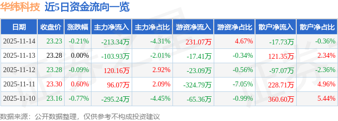 证券之星消息,截至2025年11月14日收盘,华纬科技(001380)报收于23.23元,下跌0.21%,换手率2.41%,成交量2.12万手,成交额4948.59万元。