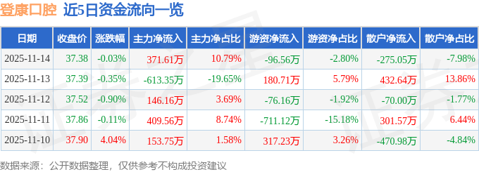 证券之星消息,截至2025年11月14日收盘,登康口腔(001328)报收于37.38元,下跌0.03%,换手率2.13%,成交量9165.0手,成交额3445.56万元。