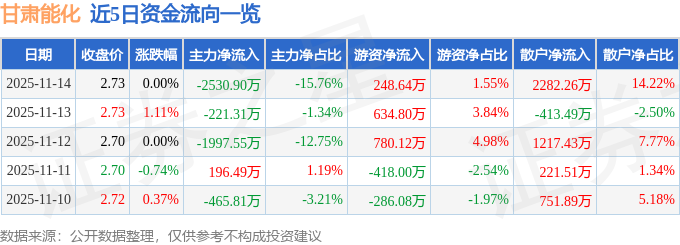 证券之星消息,截至2025年11月14日收盘,甘肃能化(000552)报收于2.73元,上涨0.0%,换手率1.57%,成交量58.68万手,成交额1.61亿元。