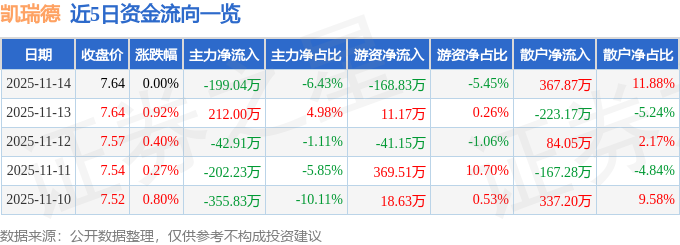 证券之星消息,截至2025年11月14日收盘,凯瑞德(002072)报收于7.64元,上涨0.0%,换手率1.36%,成交量4.05万手,成交额3096.24万元。