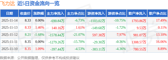 证券之星消息,截至2025年11月14日收盘,飞力达(300240)报收于8.33元,上涨0.0%,换手率3.37%,成交量12.26万手,成交额1.03亿元。