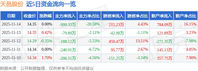 11月14日的资金流向数据方面,主力资金净流出999.33万元,占总成交额20.58%,游资资金净流入215.23万元,占总成交额4.43%,散户资金净流入784.09万元,占总成交额16.15%。
