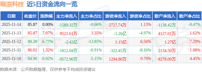 11月14日的资金流向数据方面,主力资金净流出1589.32万元,占总成交额0.66%,游资资金净流入2727.74万元,占总成交额1.13%,散户资金净流出1138.42万元,占总成交额0.47%。