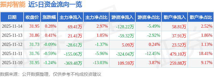 证券之星消息,截至2025年11月14日收盘,振邦智能(003028)报收于31.95元,上涨0.28%,换手率1.03%,成交量7294.0手,成交额2334.7万元。