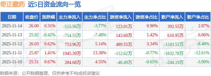 证券之星消息,截至2025年11月14日收盘,奇正藏药(002287)报收于26.0元,上涨0.31%,换手率0.91%,成交量5.22万手,成交额1.37亿元。