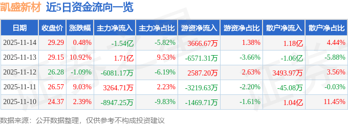 证券之星消息,截至2025年11月14日收盘,凯盛新材(301069)报收于29.29元,上涨0.48%,换手率21.77%,成交量85.16万手,成交额26.53亿元。