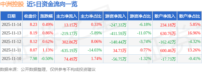 证券之星消息,截至2025年11月14日收盘,中洲控股(000042)报收于8.23元,上涨0.49%,换手率0.73%,成交量4.84万手,成交额4000.2万元。