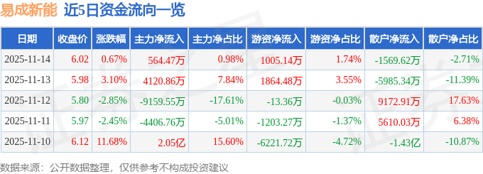 证券之星消息,截至2025年11月14日收盘,易成新能(300080)报收于6.02元,上涨0.67%,换手率5.13%,成交量95.95万手,成交额5.78亿元。