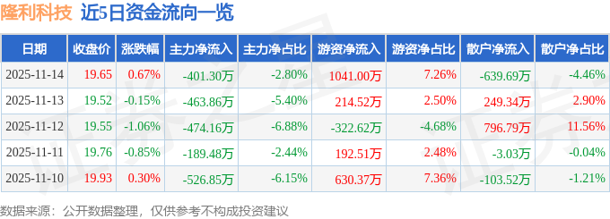 证券之星消息,截至2025年11月14日收盘,隆利科技(300752)报收于19.65元,上涨0.67%,换手率4.62%,成交量7.26万手,成交额1.43亿元。