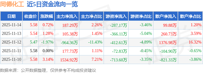证券之星消息,截至2025年11月14日收盘,同德化工(002360)报收于5.58元,上涨0.72%,换手率4.54%,成交量14.88万手,成交额8303.08万元。