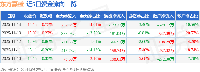 证券之星消息,截至2025年11月14日收盘,东方嘉盛(002889)报收于15.13元,上涨0.73%,换手率1.31%,成交量3.3万手,成交额5012.94万元。