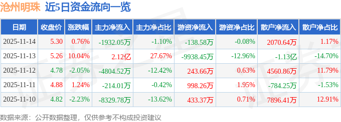 证券之星消息,截至2025年11月14日收盘,沧州明珠(002108)报收于5.3元,上涨0.76%,换手率20.12%,成交量331.44万手,成交额17.64亿元。
