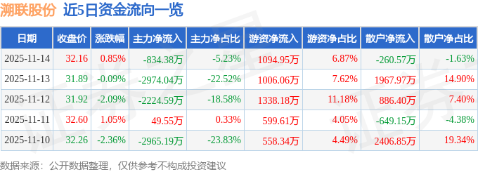 证券之星消息,截至2025年11月14日收盘,溯联股份(301397)报收于32.16元,上涨0.85%,换手率6.93%,成交量4.9万手,成交额1.59亿元。