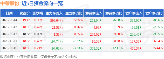 证券之星消息,截至2025年11月14日收盘,中荣股份(301223)报收于19.13元,上涨0.9%,换手率1.75%,成交量1.96万手,成交额3737.39万元。
