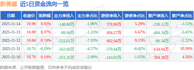 11月14日的资金流向数据方面,主力资金净流出140.84万元,占总成交额1.96%,游资资金净流入378.96万元,占总成交额5.29%,散户资金净流出238.12万元,占总成交额3.32%。