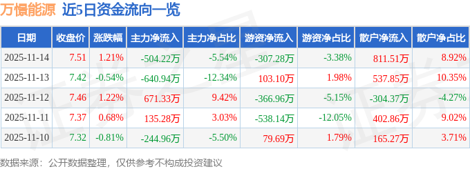 证券之星消息,截至2025年11月14日收盘,万憬能源(002700)报收于7.51元,上涨1.21%,换手率4.59%,成交量12.11万手,成交额9100.75万元。