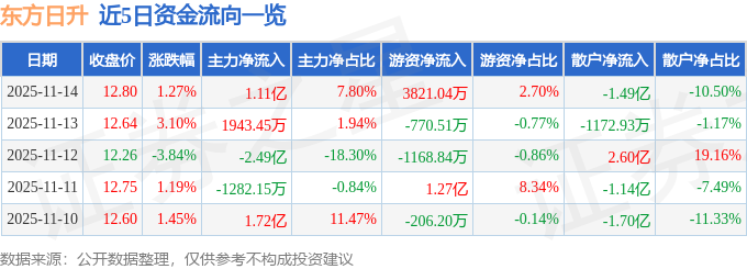 证券之星消息,截至2025年11月14日收盘,东方日升(300118)报收于12.8元,上涨1.27%,换手率11.85%,成交量109.86万手,成交额14.17亿元。