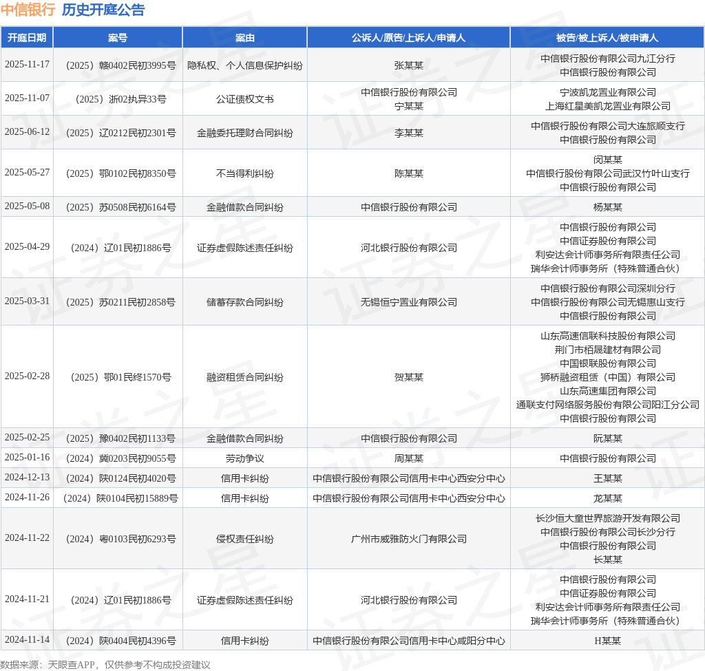 案号:(2025)赣0402民初3995号根据统计,近一年内以中信银行股份有限公司为当事人的历史开庭公告有15则,其中案由为“信用卡纠纷”的公告以3则居首,其次为“证券虚假陈述责任纠纷”有2则,“金融借款合同纠纷”有2则。历史开庭公告如下: