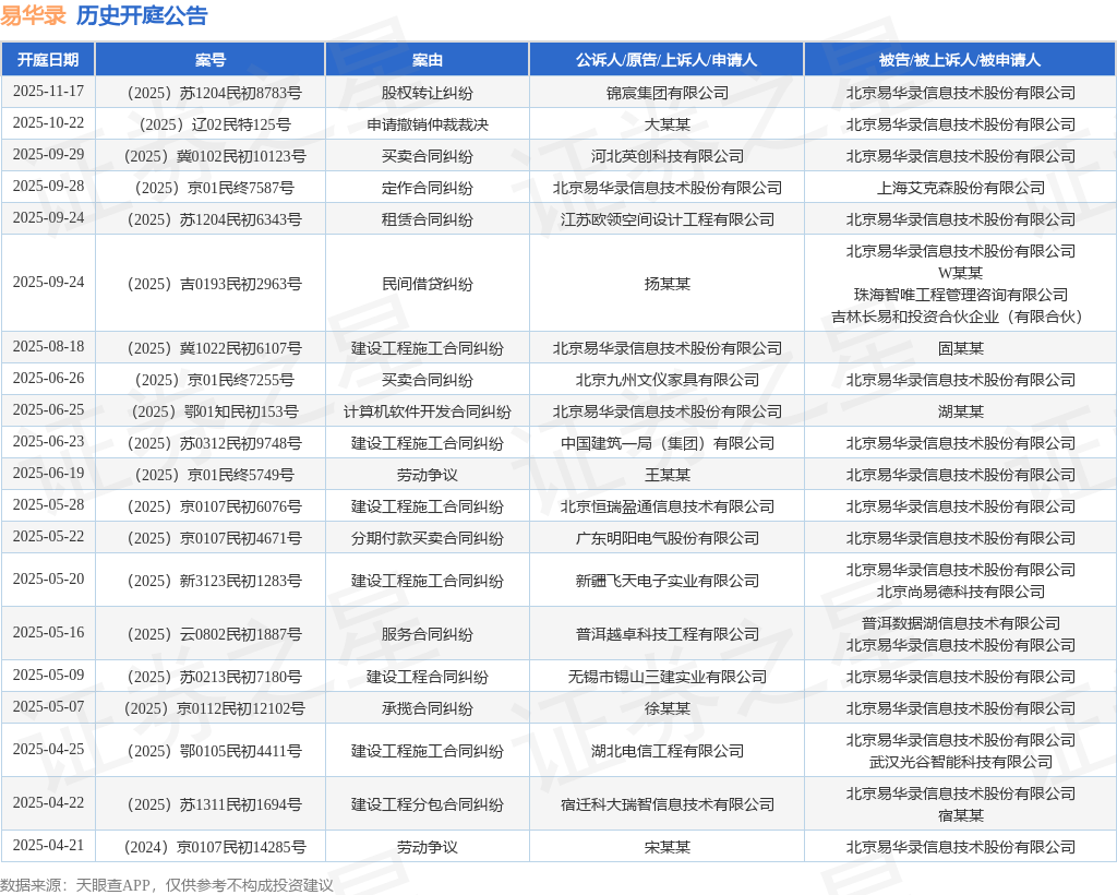 案号:(2025)苏1204民初8783号根据统计,近一年内以北京易华录信息技术股份有限公司为当事人的历史开庭公告有42则,其中案由为“建设工程施工合同纠纷”的公告以11则居首,其次为“买卖合同纠纷”有7则,“劳动争议”有4则。历史开庭公告(前20条)如下: