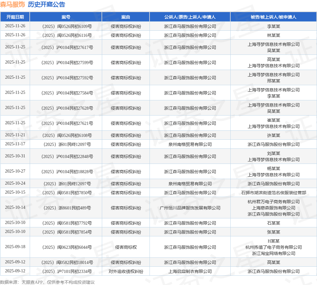 案号:(2025)浙01民终12097号根据统计,近一年内以浙江森马服饰股份有限公司为当事人的历史开庭公告有43则,其中案由为“侵害商标权纠纷”的公告以36则居首,其次为“侵害商标权”有5则,“侵害商标权及不正当竞争纠纷”有1则。历史开庭公告(前20条)如下: