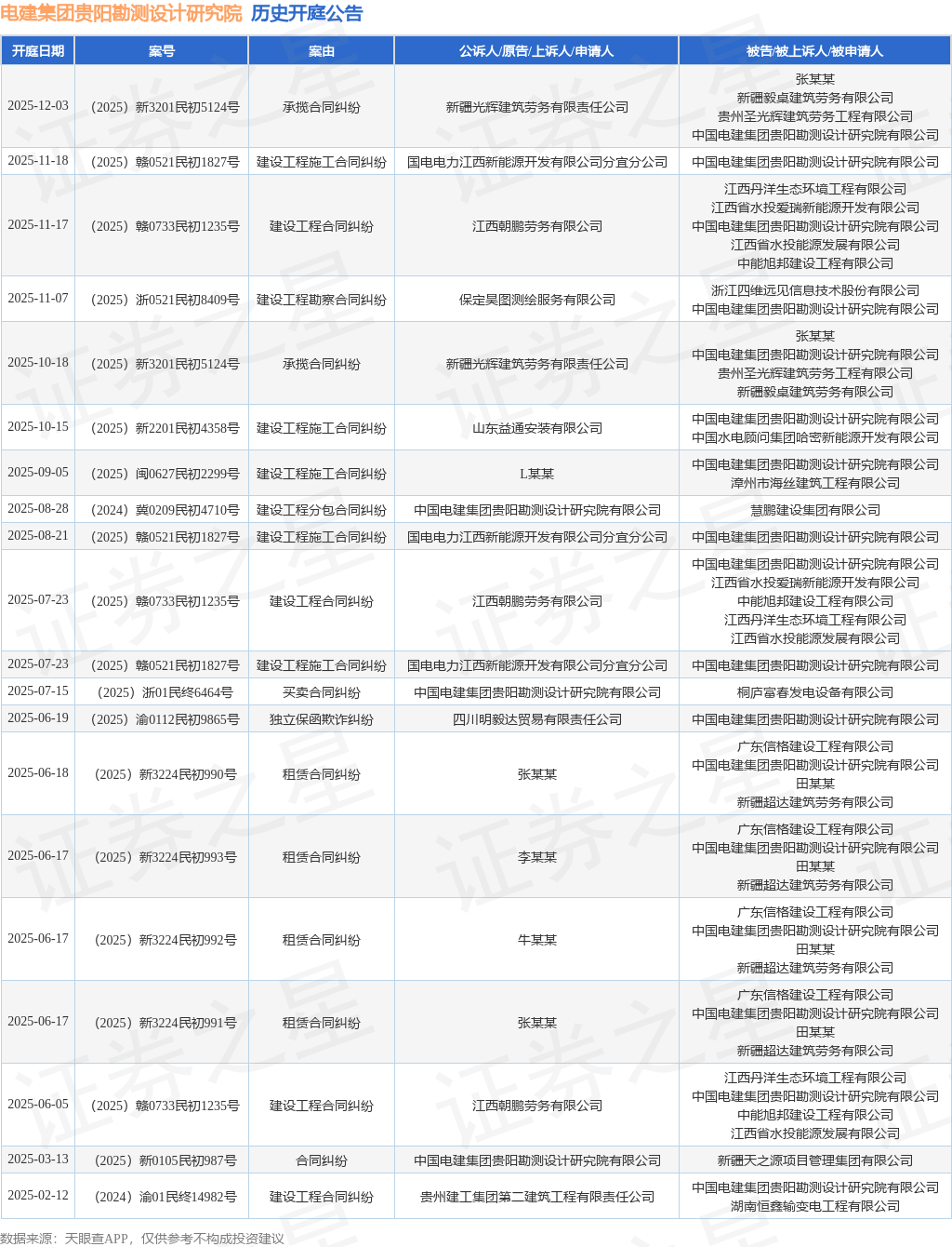 案号:(2025)赣0733民初1235号根据统计,近一年内以中国电建集团贵阳勘测设计研究院有限公司为当事人的历史开庭公告有26则,其中案由为“建设工程施工合同纠纷”的公告以6则居首,其次为“建设工程合同纠纷”有5则,“租赁合同纠纷”有4则。历史开庭公告(前20条)如下: