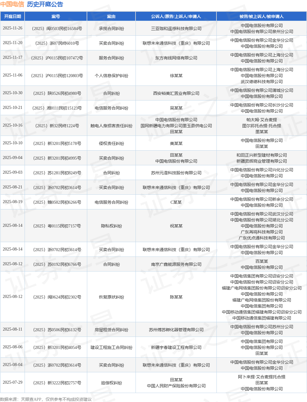 案号:(2025)沪0115民初107472号根据统计,近一年内以中国电信股份有限公司为当事人的历史开庭公告有58则,其中案由为“买卖合同纠纷”的公告以12则居首,其次为“合同纠纷”有9则,“电信服务合同纠纷”有8则。历史开庭公告(前20条)如下: