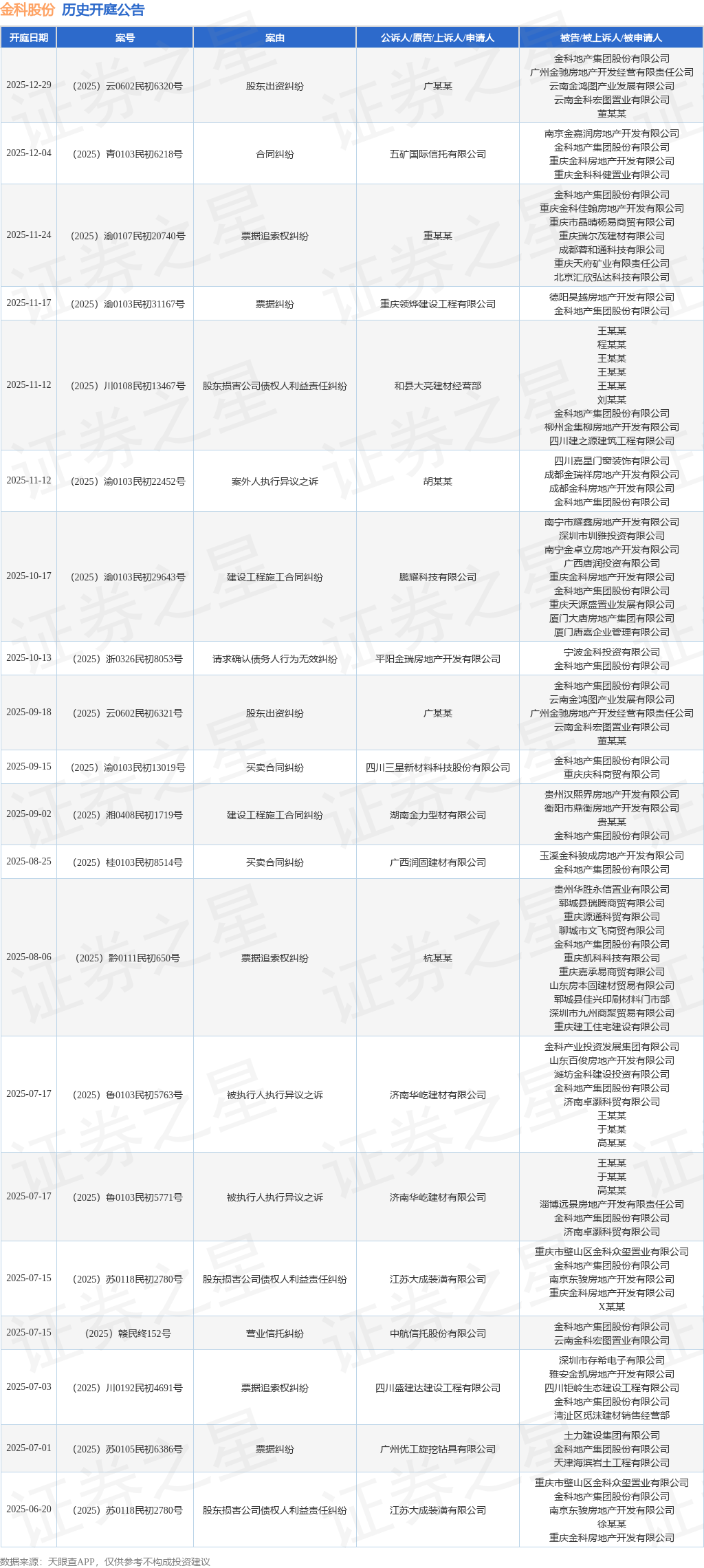 案号:(2025)渝0103民初31167号根据统计,近一年内以金科地产集团股份有限公司为当事人的历史开庭公告有129则,其中案由为“票据纠纷”的公告以38则居首,其次为“票据追索权纠纷”有16则,“劳动争议”有13则。历史开庭公告(前20条)如下:
