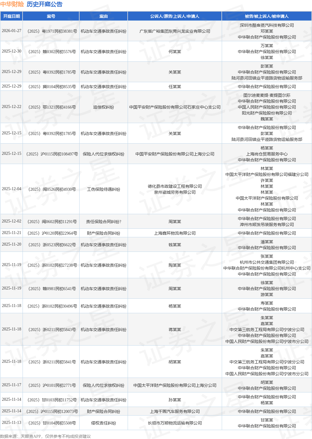 案号:(2025)沪0101民初2771号根据统计,近一年内以中华联合财产保险股份有限公司为当事人的历史开庭公告有702则,其中案由为“机动车交通事故责任纠纷”的公告以382则居首,其次为“财产保险合同纠纷”有58则,“保险人代位求偿权纠纷”有42则。历史开庭公告(前20条)如下: