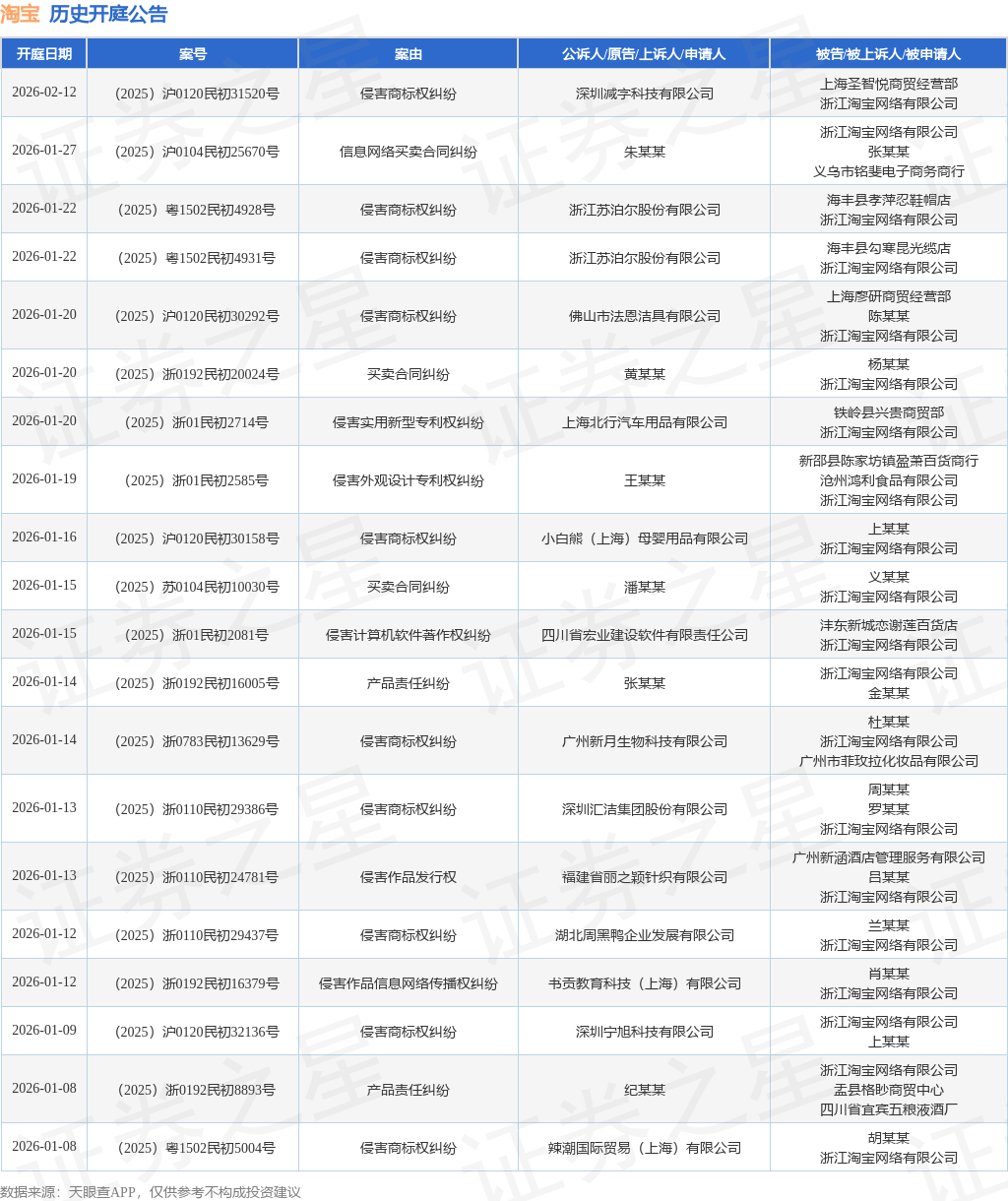案号:(2025)浙0110民初22608号根据统计,近一年内以浙江淘宝网络有限公司为当事人的历史开庭公告有7400则,其中案由为“侵害商标权纠纷”的公告以3292则居首,其次为“网络服务合同纠纷”有743则,“著作权权属、侵权纠纷”有532则。历史开庭公告(前20条)如下: