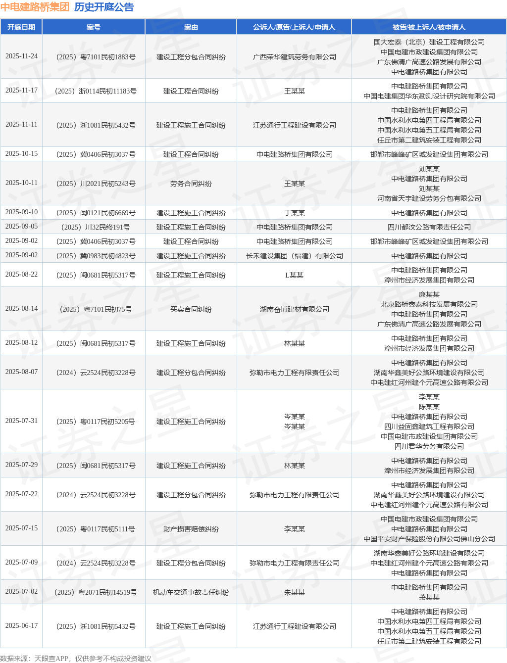 案号:(2025)浙0114民初11183号根据统计,近一年内以中电建路桥集团有限公司为当事人的历史开庭公告有59则,其中案由为“建设工程施工合同纠纷”的公告以23则居首,其次为“建设工程分包合同纠纷”有10则,“财产损害赔偿纠纷”有8则。历史开庭公告(前20条)如下: