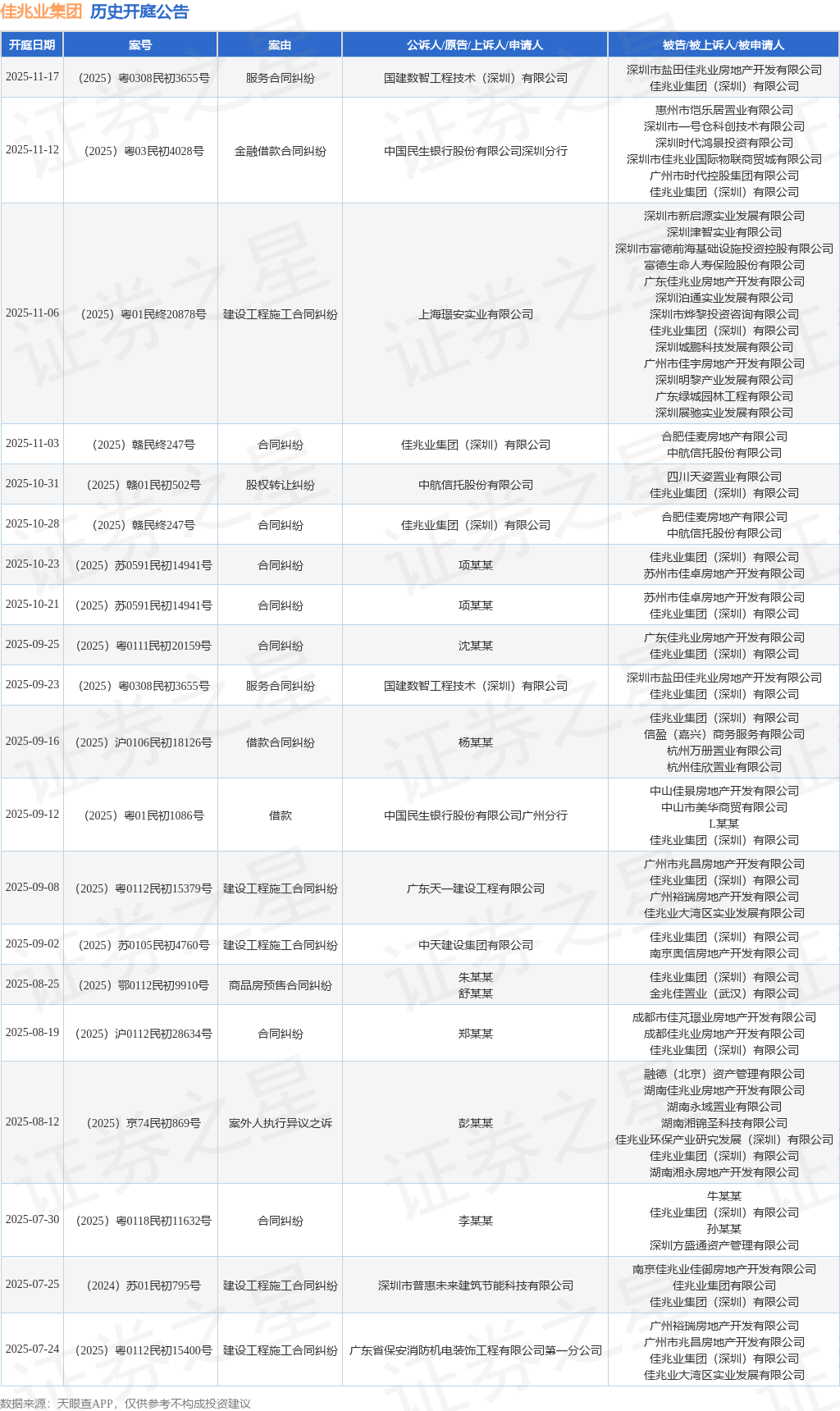 案号:(2025)粤0308民初3655号根据统计,近一年内以佳兆业集团(深圳)有限公司为当事人的历史开庭公告有103则,其中案由为“合同纠纷”的公告以21则居首,其次为“建设工程施工合同纠纷”有17则,“商品房预售合同纠纷”有15则。历史开庭公告(前20条)如下: