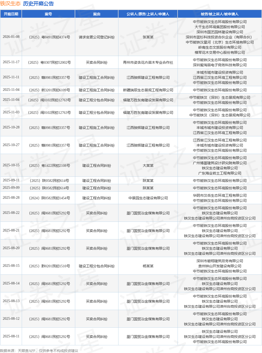 案号:(2025)粤0307民初52002号根据统计,近一年内以中节能铁汉生态环境股份有限公司为当事人的历史开庭公告有76则,其中案由为“买卖合同纠纷”的公告以29则居首,其次为“建设工程施工合同纠纷”有13则,“建设工程分包合同纠纷”有12则。历史开庭公告(前20条)如下: