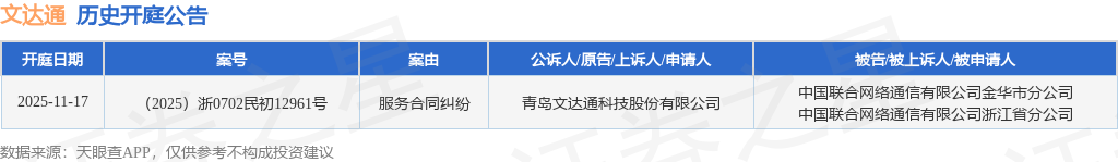 证券之星消息,根据天眼查APP显示,近日公布了一则青岛文达通科技股份有限公司作为原告/上诉人的开庭公告,详细内容如下: